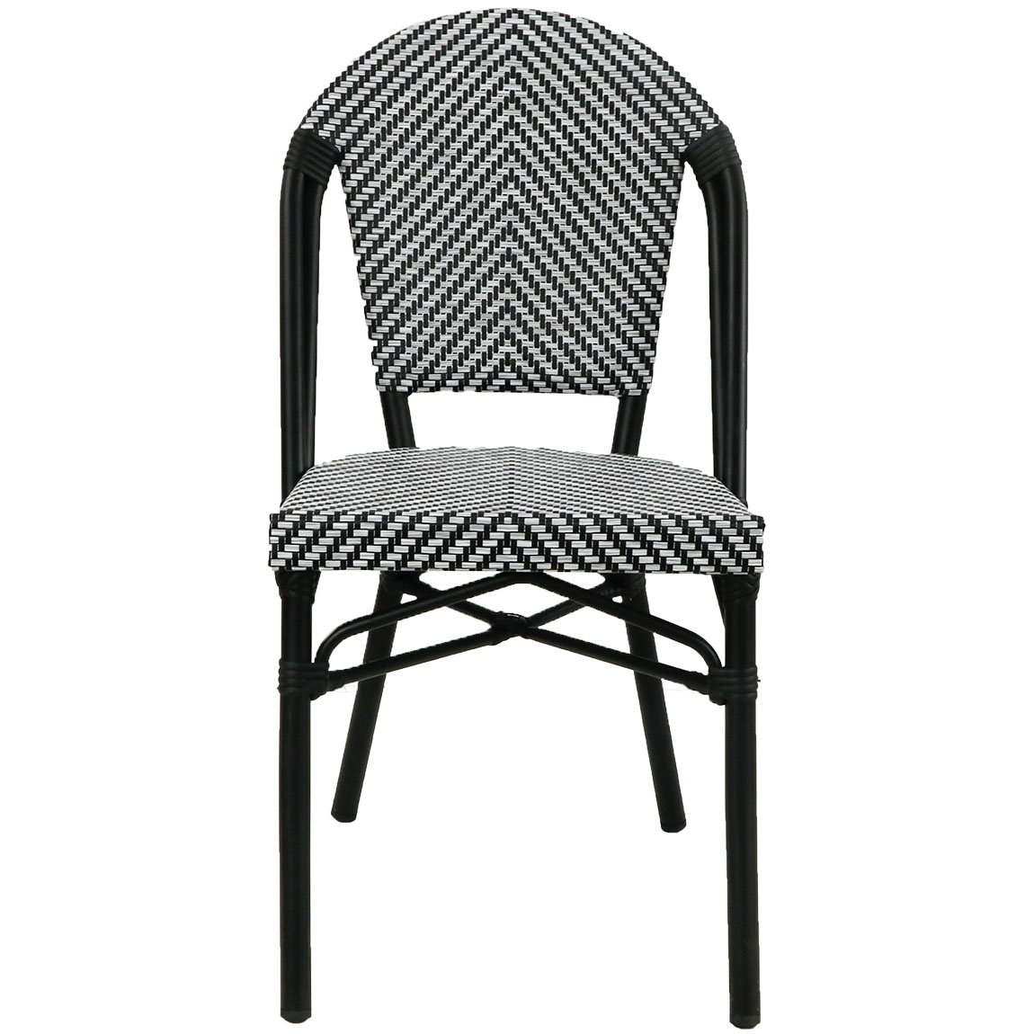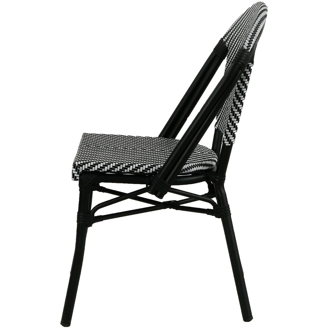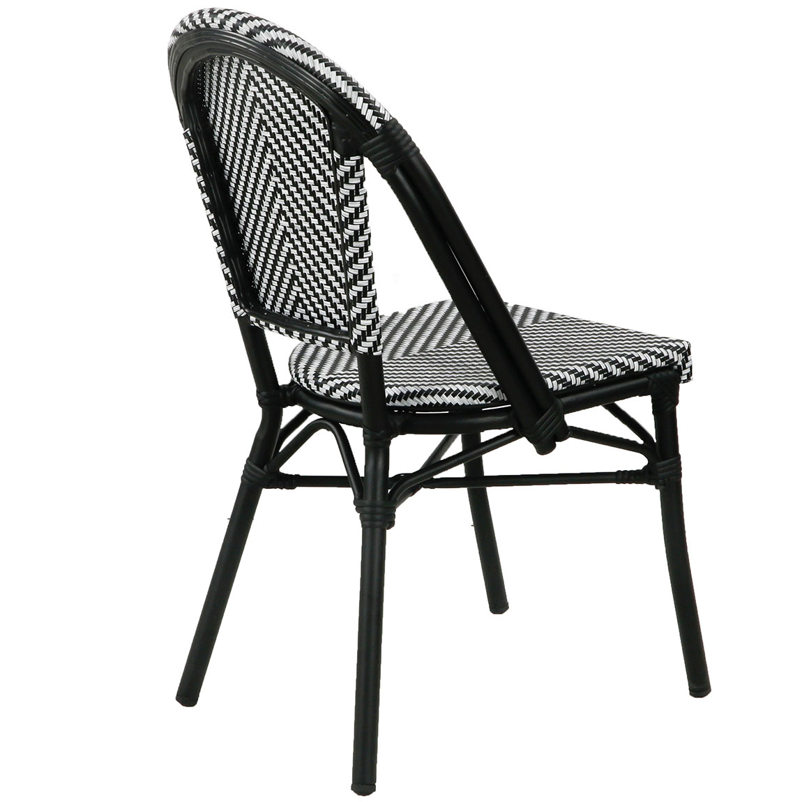 Franse bistrostoel model Drouot, ook wel bekend als een Parijse bistrostoel. Deze stijlvolle stoel is een type stoel dat vaak wordt geassocieerd met de traditionele Franse bistro's en cafés. De stoel heeft als kenmerkend ontwerp een aluminium frame en een zitting en rugleuning die gemaakt is van gevlochten rotan (wicker). Deze stoel is licht van gewicht, stapelbaar en duurzaam, wat deze bistrostoel geschikt maakt voor binnen en buiten gebruik.