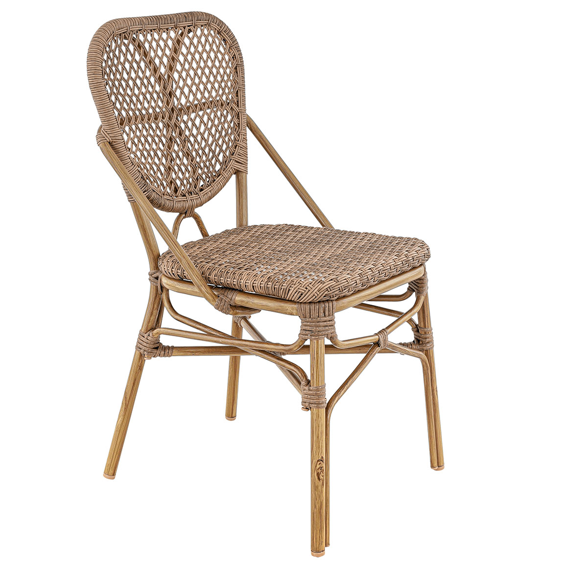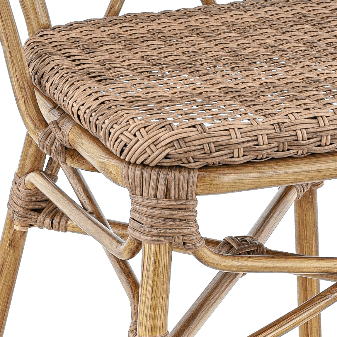 De DAX stoel heeft een aluminium frame met een buisdiameter van ø25 mm en een buisdikte van 1,8 mm. Deze robuuste constructie wordt geaccentueerd door een poedercoating in een authentieke bamboe look, terwijl de zitting en rugleuning zijn afgewerkt met gevlochten rotan voor een verfijnde en natuurlijke uitstraling.