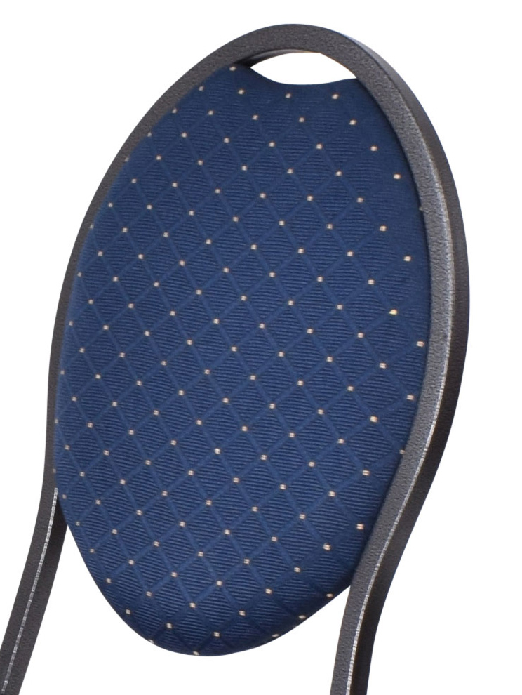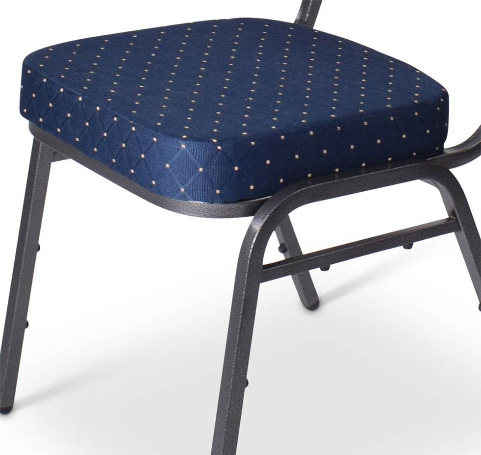 Stackchair stapelstoel model Sidney. Deze stoel heeft een blauw stoffen bekleding met gouden stippen. De stoel heeft een klassieke uitstraling, is goed afgewerkt en stapelbaar tot 12 stoelen. De welbekende stackchair is een van de populairste stoelen onder de stapelstoelen. De stoel heeft een metalen frame (hamerslag) van 20 x 20 x 1,2 mm, dit betekent dat het een zeer degelijk onderstel heeft. De zitting is voorzien van een 6 cm stevige schuimzitting wat voor extra zitcomfort zorgt. De stoel is stevig en stabiel, zeer geschikt voor professioneel gebruik. Dit kenmerkt zich onder andere door een extra verstevigingsbalk onder de zitting, goede stootbestendige poedercoating en een high density foam zitting.