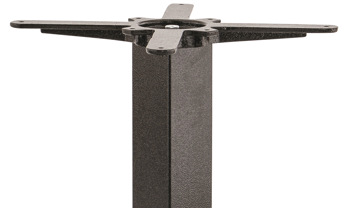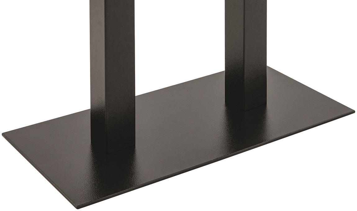 Statafelonderstel metaal met rechthoekige voet en dubbele poot. Het onderstel is 108 cm hoog en heeft een rechthoekige voet met een afmeting van 80 x 40 cm en is voorzien van 4 steldoppen. De rechthoekige metalen plaat is 7 mm dik en de buisdikte is 80 x 80 mm. Het onderstel is gepoedercoat waardoor de verflaag slijtvaster is geworden. De bovenkant van het onderstel is voorzien van 2 kruissjablonen waarop het tafelblad bevestigd kan worden. Geschikt voor indoor gebruik.