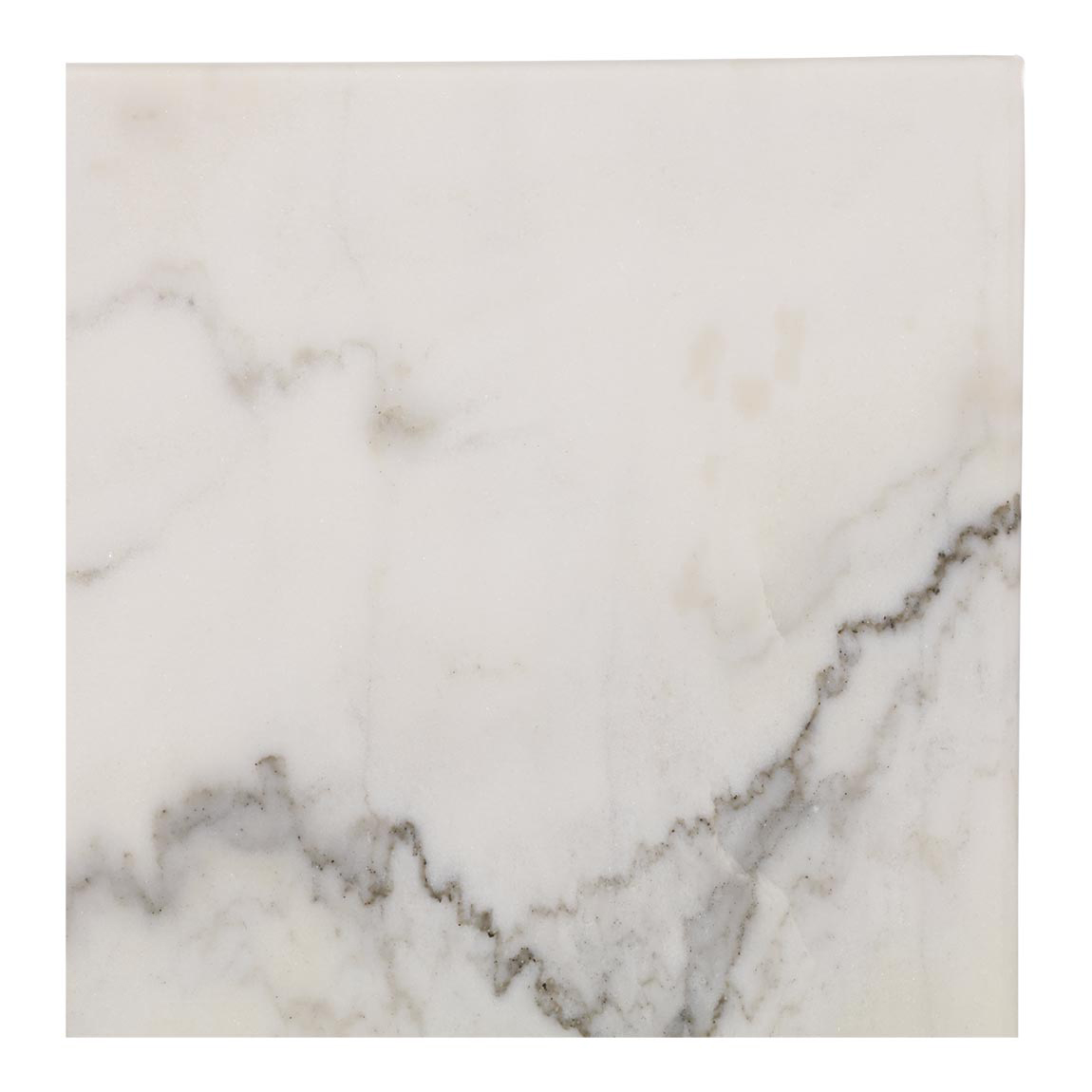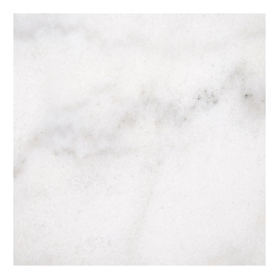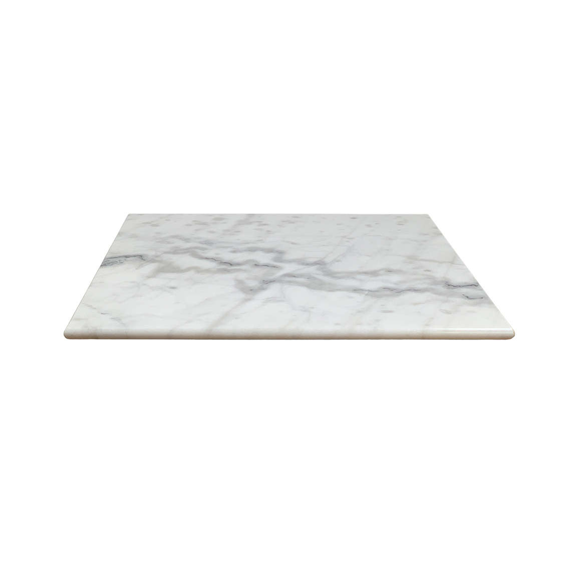 Vierkant wit marmer tafelblad met kleurschakeringen waar grijze aders en kristallen inzitten. Het tafelblad is 2 cm dik en heeft een afmeting van 60 x 60 cm. Dit tafelblad is heeft een vlakke onderkant waardoor het geschikt is voor diverse modellen tafelonderstellen.